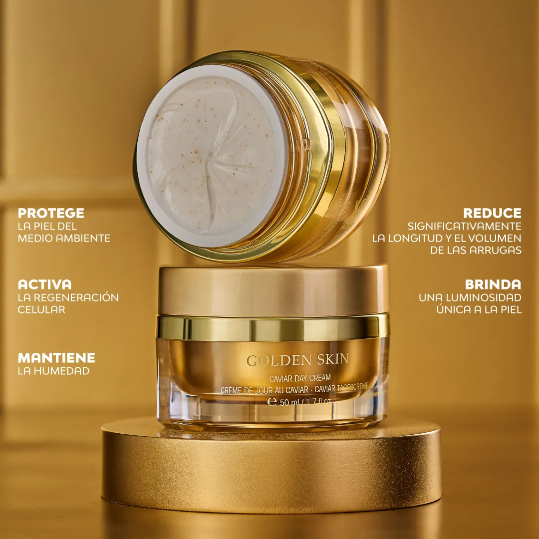 Golden Skin Caviar Day Cream: Aqua [Agua], Triglicérido Cáprico/Caprílico, Pentilenglicol, Polideceno Hidrogenado, Distearato de Metilglucosa Poliglicerilo-3, Alcohol Cetílico, Benzoato de Alquilo C12-15, Estearato de Glicerilo, Dietanoato de Neopentilglicol, Fenoxietanol, Isododecano, Creatina, Laurato de Isoamil, Sodio Estearoil Glutamato, Acetato de Tocoferilo, Poliacrilato de Sodio, Tribehenina, Propilenglicol, Butilenglicol, Etilhexilglicerina, Glicerina, Extracto de Miel, Perfume [Fragancia], Ceramida NG, Fitoesteroles PEG-10, Ácido Láctico, Ácido Glutámico, Glicoproteínas, CI 77480 [Oro], Extracto de Caviar, Úrea, Treonina, Valina, Arginina HCL, Lisina HCL, Ornitina HCL, Lactato de Sodio, Palmitoil Hexapéptido-12.