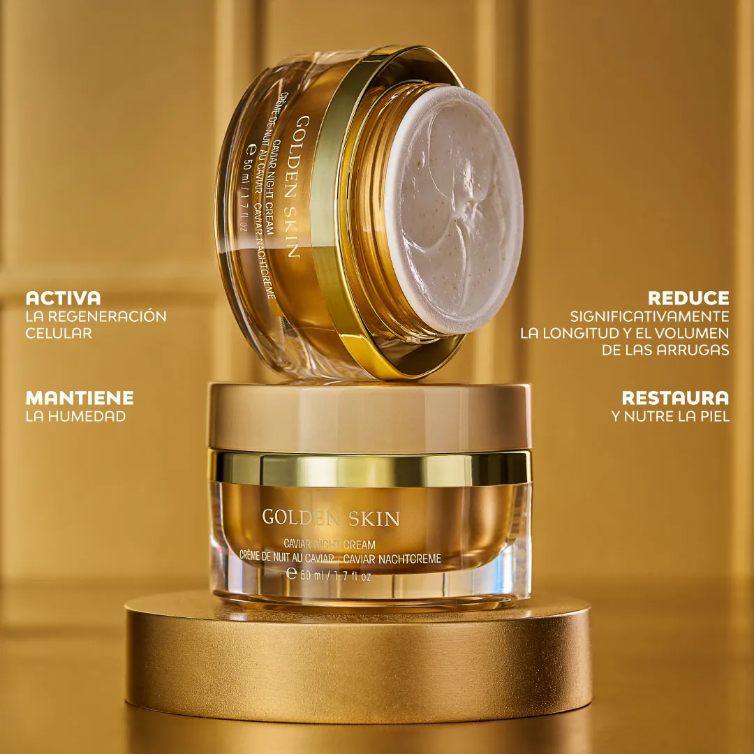 Golden Skin Caviar Night Cream: La crema de alta calidad se utiliza para la reestructuración y el cuidado dirigido de la piel. El complejo de ingredientes activos de oro y caviar previene la pérdida de humedad epidérmica, optimizando así el equilibrio de humedad de la piel. Las propiedades regenerativas también proporcionan una tez suave y firme.