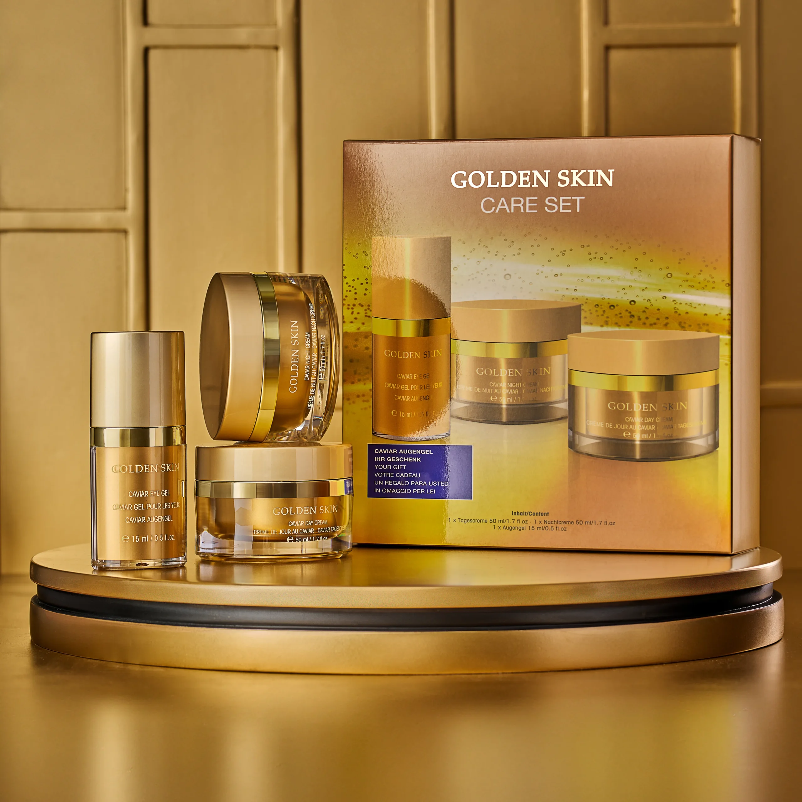 El set de cuidado contiene la Golden Skin Caviar Day Cream, la Golden Skin Caviar Night Cream y Golden Skin Caviar Eye Gel.