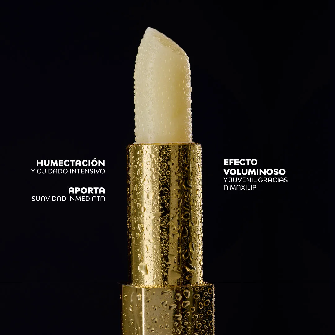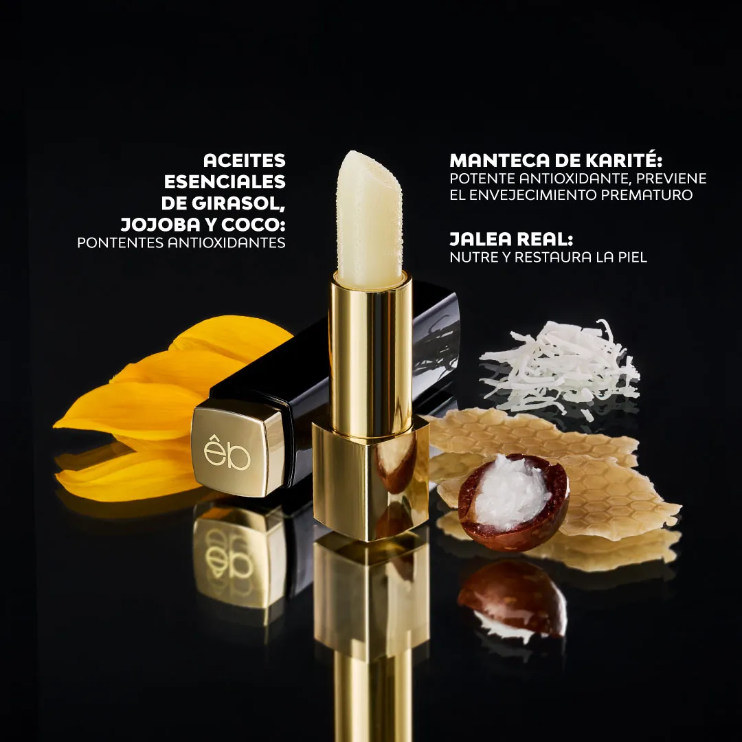 Aceite de Ricinus Communis (Semilla de Ricino), Cera Alba (Cera de Abejas), Aceite de Semilla de Simmondsia Chinensis (Jojoba), Triglicéridos C10-18, Lanolina, Aroma, Aceite de Semilla de Helianthus Annuus (girasol), Aceite de Cocos Nucifera (Coco) Oil, Jalea Real, Palmitato de Etilhexilo, Extracto de Propolio, Tribehenina, Tribehenina, Sorbitán Isostearato, Limoneno, Palmitoil Oligopéptido, Linalol, Citral.
