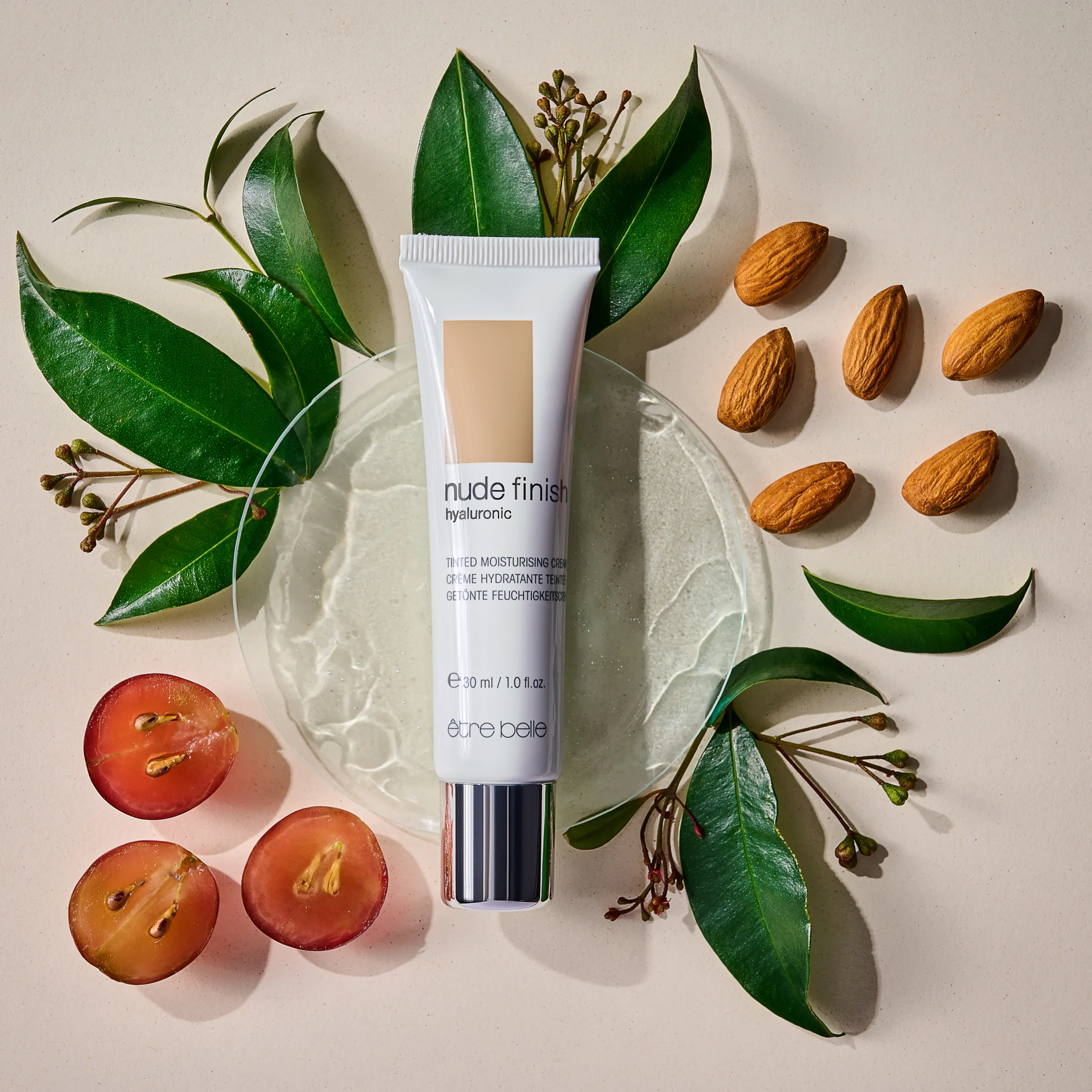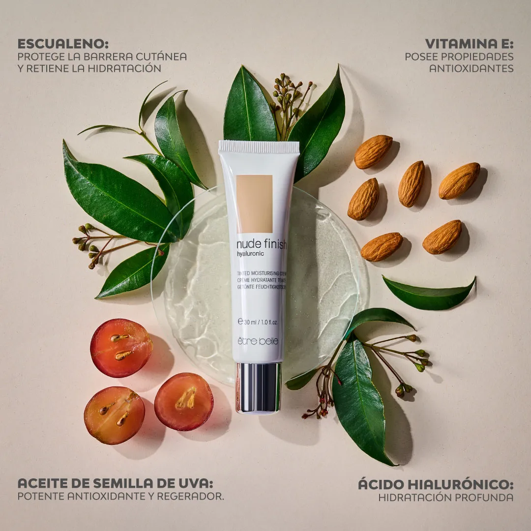 Aqua [Agua], Dicaprilil Éter, Glicerina, Alcohol Cetearílico, Estearato de Glicerilo, CI 77891 [Dióxido de Titanio], Cetearil Etilhexanoato, Aceite de Olea Europaea (Oliva), Palmitoil Hidrolizado de Proteína de Trigo, Ceteareth-20, Ciclopentasiloxano, Lactilato Estearoil de Sodio, Escualano, Aceite de Semilla de Vitis Vinifera (Uva), CI 77492 [Óxido de Hierro], Fenoxietanol, Sorbitol, Poliacrilato de Sodio, Dimeticona, Tocoferol, CI 77491 [Óxido de Hierro], Parfum [Fragancia], Mica (CI 77019), Goma de Xantano, Ácido Benzoico, CI 77499 [Óxido de Hierro], Ácido Dehidroacético, Hialuronato de Sodio, Disodio Glutamato Estearoilado, CI 77002 (Hidróxido de Aluminio).