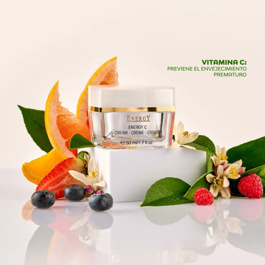 Vitamina C: Es considerada multiusos. Mejora la síntesis de las microproteínas y el colágeno en los tejidos. Protege la piel de los radicales libres que dañan las células, que son grupos agresivos de moléculas que aceleran el proceso de envejecimiento. Estos pueden producirse, por ejemplo, cuando la luz solar penetra en la piel. La vitamina C atrapa estas partículas agresivas en la piel y las neutraliza. La vitamina E también es un eliminador de radicales libres. La combinación de estos dos compuestos con efectos similares es interesante porque la vitamina C puede ayudar a que la vitamina E agotada restaure la protección celular.